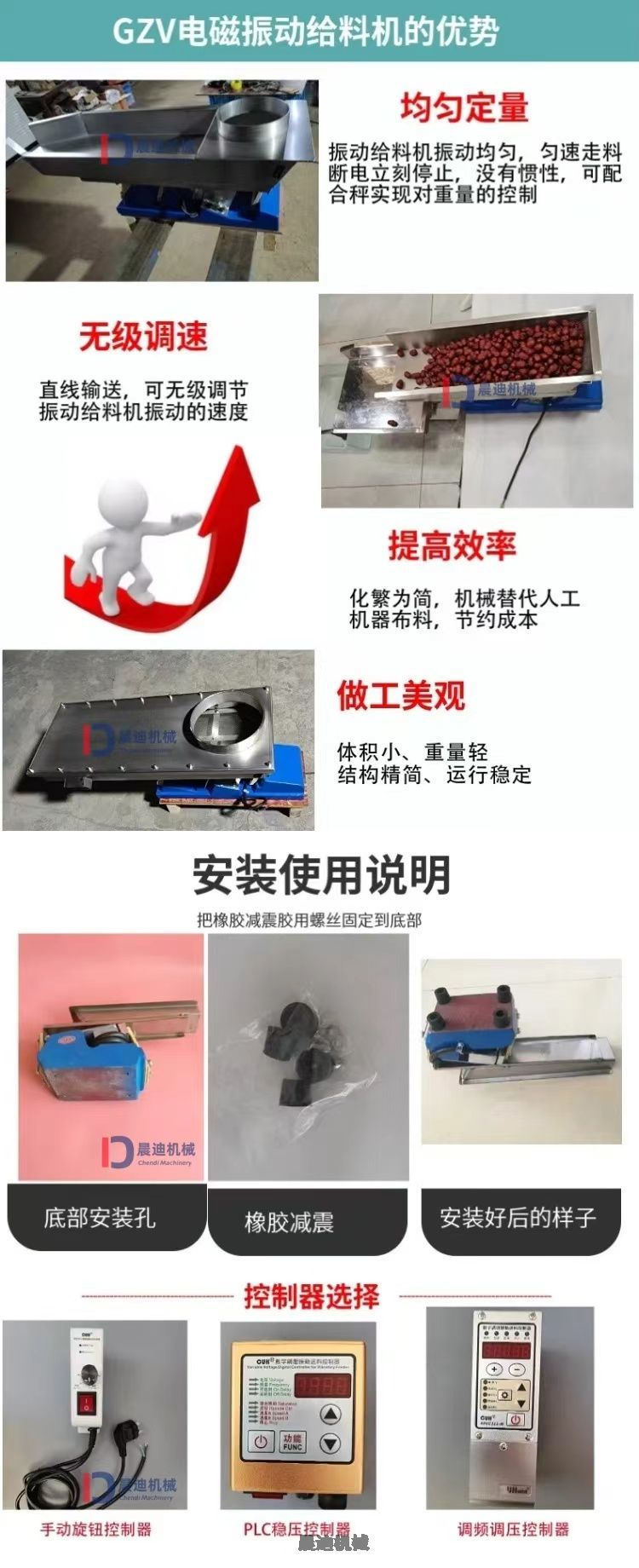 三门峡微型电磁给料机厂家 GZV2座式给料机是一款不锈钢座式给料机,料槽材质、尺寸和样式可按照客户需求定制,用于粉状和颗粒状物料的给料配料和定量包装等生产流程中,常用的GZV1/GZV2/GZV3/GZV4/GZV5/GZV6等,配用电磁给料机自动稳幅控制箱,可使其不受电源电压波动的影响,提高给料精度。微型电磁给料机工作时可以直接放置在操作台上或直接和料仓衔接在一起,把料仓里面的物料输送到受料装置中,实现流水线作业生产的自动化,广泛用于实验、食品、化工、粮食加工等行业,欢迎来电咨询选购15937360507