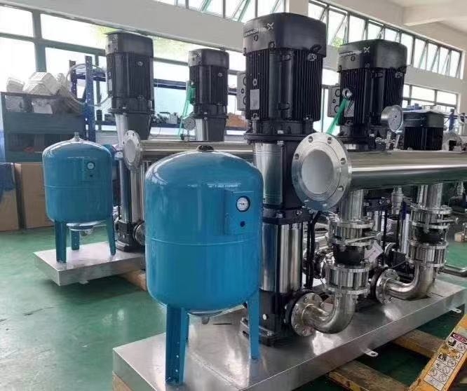 稳压泵组:稳压泵组主要由一至二台小流量水泵构成,其供水扬程大于或等于主泵的供水扬程。它只在管网小流量或零流量时(例如夜晚)时自动投入运行,维护管网的压力,补充小流量用水或管网的渗漏,同时使主泵在小流量和零流量用水时处于停机状态。